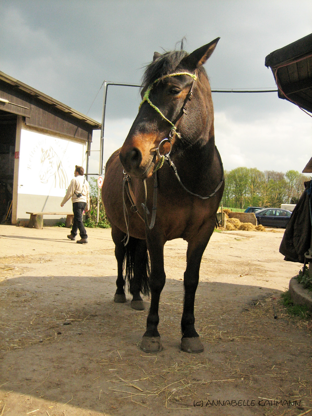 Außerdem haben wir Farahs neu gestaltete Trense eingeweiht! Nachdem ich meine Rastas wieder rausgeflochten hatte, habe ich aus den grünen und blonden Kusthaaren einen Stirnriemen für Farah gebastelt!